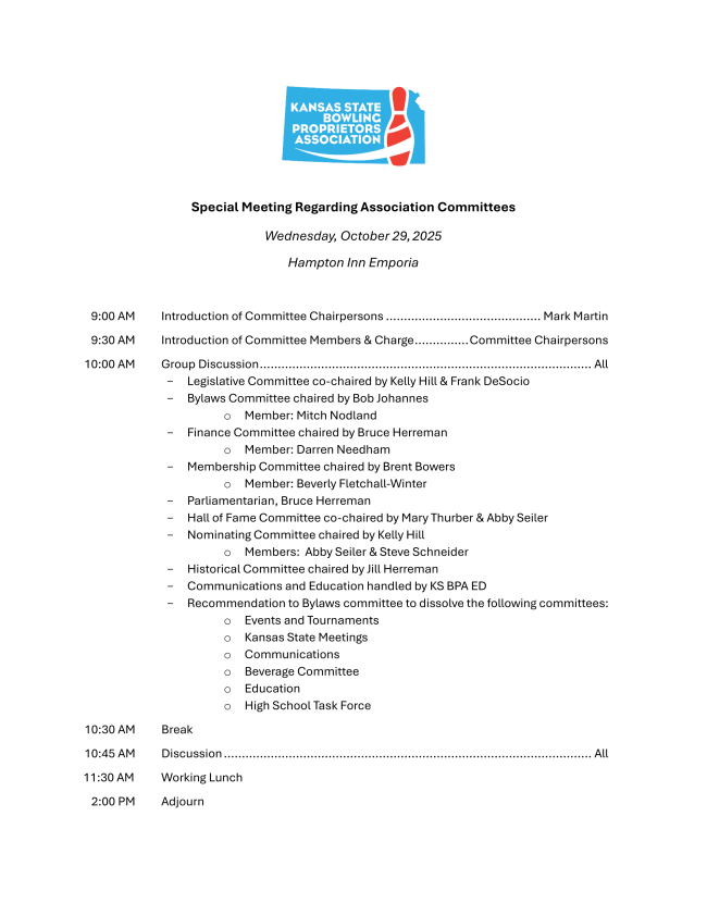 Please plan to come to Emporia to join in discussions about the future plans of the KS State BPA's work—specifically which committees are most relevant today.